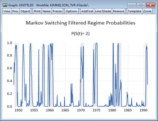 Lastly, we display the smoothed regime probabilities selecting and clicking on to accept the remaining settings. After rearranging, we have:
