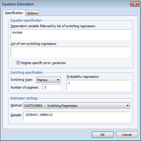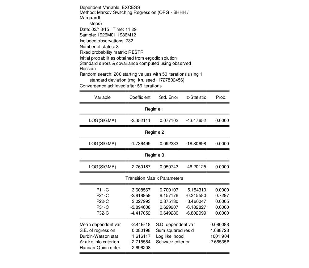 The excess returns are assumed to have mean zero so we enter only the name of the dependent variable in the topmost edit field. Since we wish to model regime heteroskedasticity, box is checked. The model assumes Markov switching probabilities with 3 regimes and constant transition probabilities.