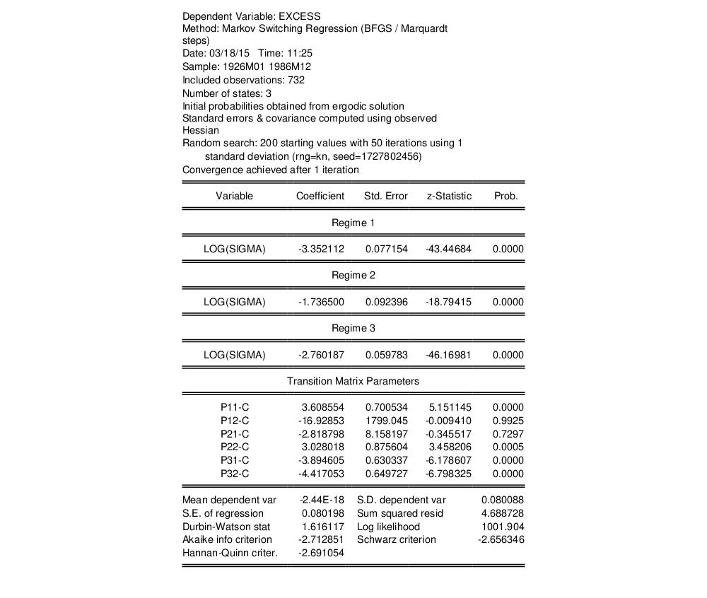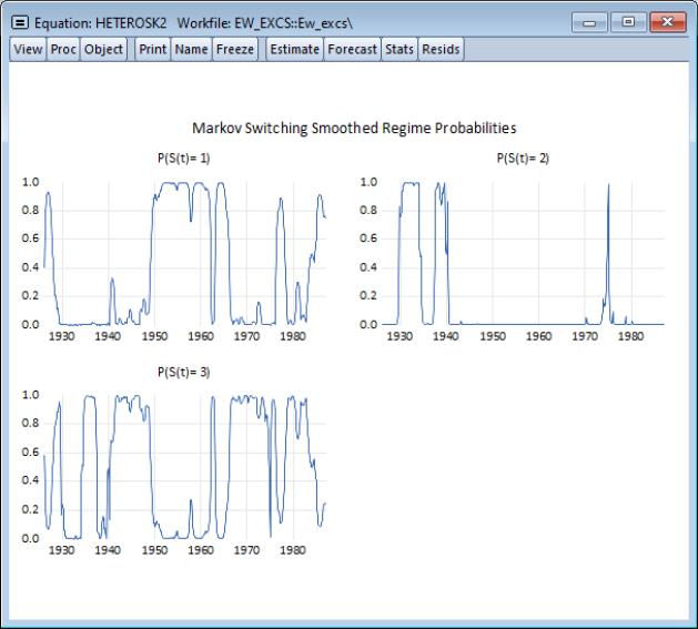 Kim and Nelson (1999) offer an example (Section 4.6, p. 86) of a three state Markov switching model of regime heteroskedastic stock returns from 1926m1–1986m12. The data, which consist of monthly CRSP equal-weighted excess returns are in the series EXCESS, provided in the workfile “ew_excs.WF1”.