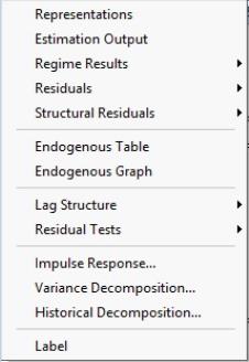Most of these routines are familiar tools for working with a VAR. You may, for example, examine plots for your estimated equation, examine the of your VAR, or use the submenu to examine properties of your residuals.