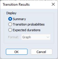 • Lastly, you may display the associated with the transition matrix in each period. The results may be displayed in (default), , or form. For constant probability models, the table form will only show the single set of expected durations.