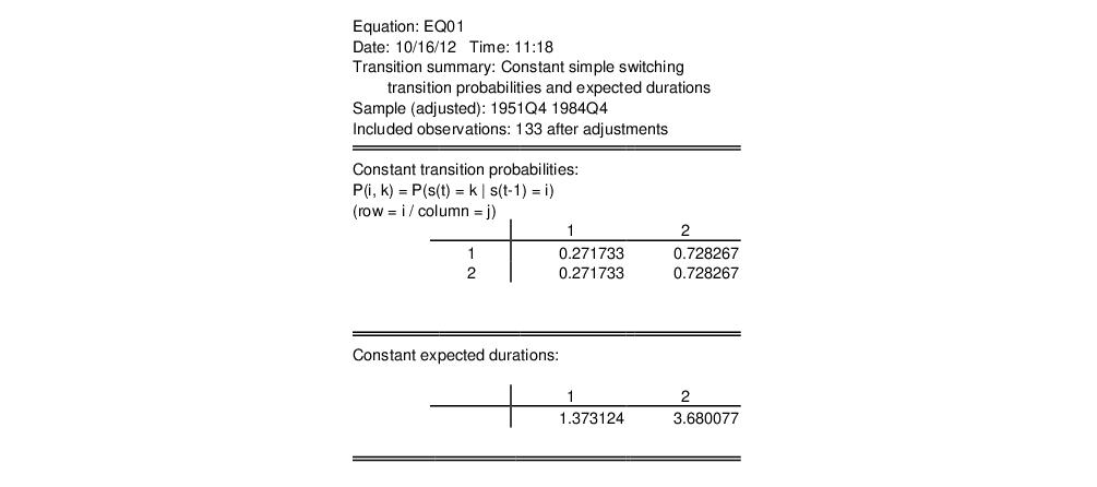 The default display shows a table containing both the transition matrix and the expected durations (Kim and Nelson, 1999, p. 71-72) implied by the transition matrix. For example,