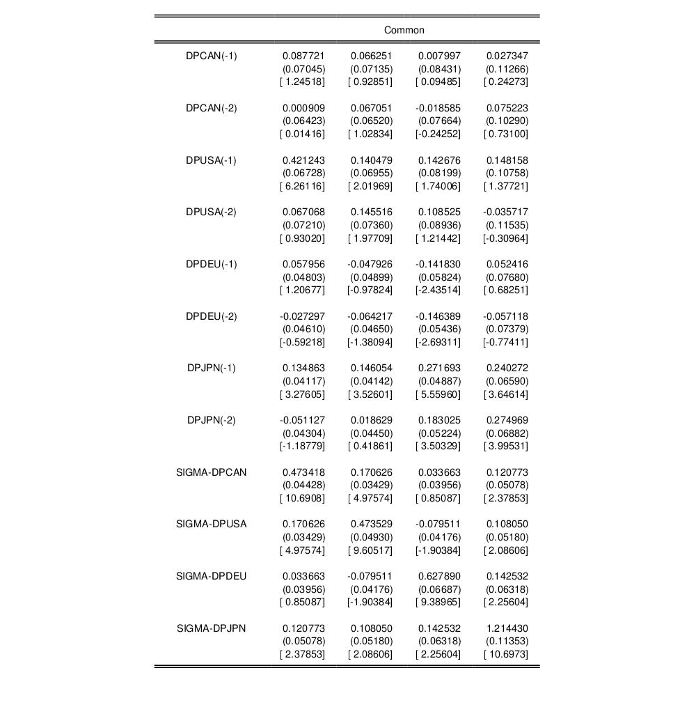 The data for this example consists of 1960q4–2018q4 quarterly percent change in GDP for Canada (DPCAN), Germany (DPDEU), Japan (DPJPN), and the US (DPUSA). The data may be found in the workfile “msvar_G7.WF1”.