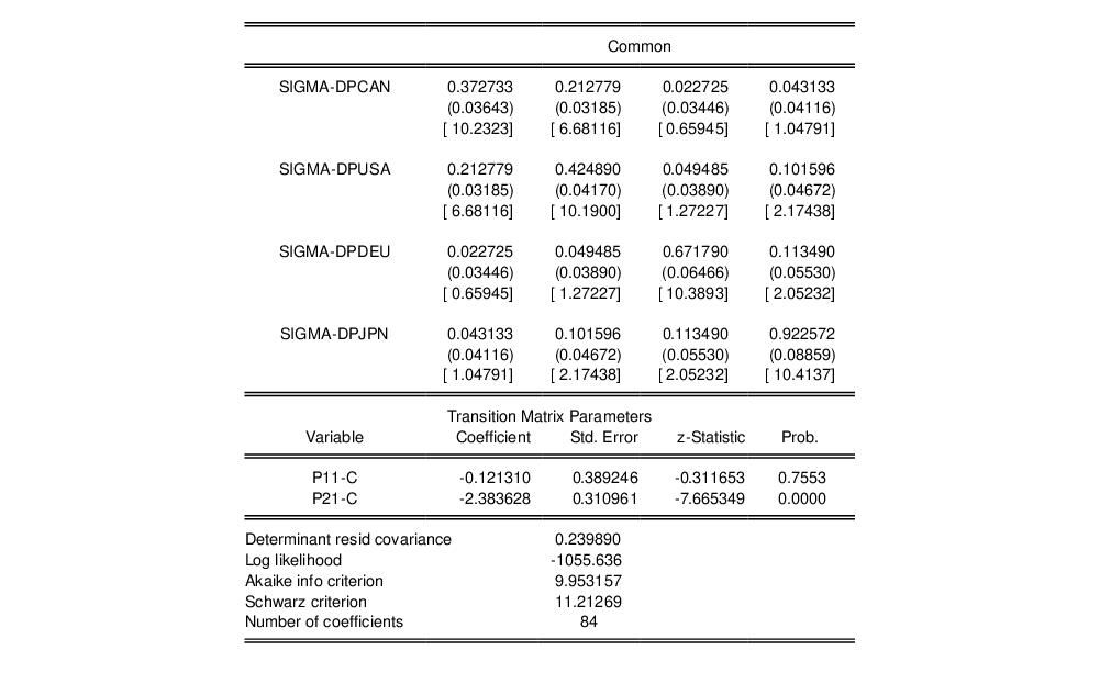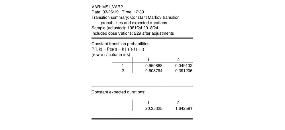 The middle section displays the coefficients for the regime specific mean and the invariant error distribution coefficients with columns corresponding to endogenous variables. We see, in the differences in the regime specific means, corresponding to fast and slow growth rates: