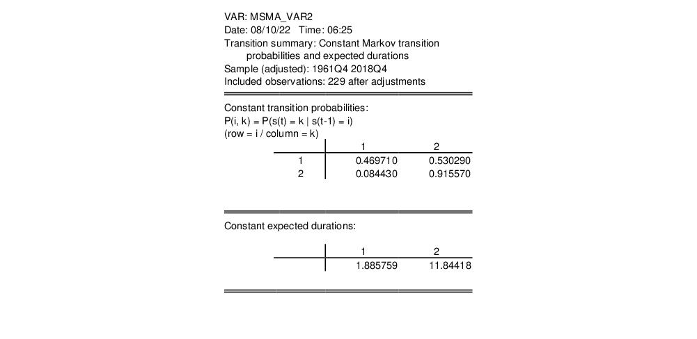 We may estimate a two-state Markov switching mean VAR(2) with switching mean regressor C, switching VAR lag coefficients. and common error variance (MSMA-VAR(2)).