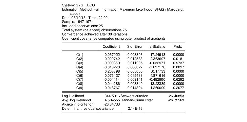 We estimate this model by full information maximum likelihood (FIML). FIML is invariant to the equation that is dropped. Press the button and choose Full Information Maximum Likelihood. Click on to perform the estimation. EViews presents the estimated coefficients and regression statistics for each equation. The top portion of the output describes the coefficient estimates: