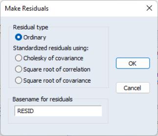 Since maximum likelihood assumes the errors are multivariate normal, we may wish to test whether the residuals are normally distributed. Click to display the residuals dialog. You may choose to save the ordinary or standardized residuals. If you choose the latter, you can elect to standardize the residuals using the Cholesky factor of the (conditional) covariance, the square root of the (conditional) correlation matrix, or the square root of the (conditional) covariance matrix. You must enter a basename for saving the residuals. The residuals will be named using the next available names in the workfile, in this case “RESID01”, “RESID02”, ...., if those names are not already used.