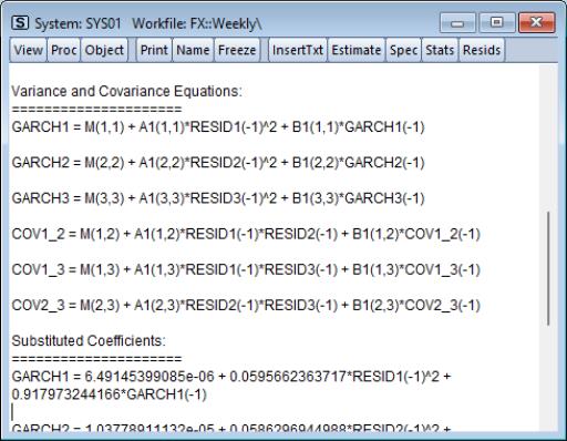 • provides you with the estimation command, the estimated equations and the substituted coefficient counterpart. For ARCH estimation this view also includes additional variance and covariance specification in matrix formation as well as single equation with and without substituted coefficients.