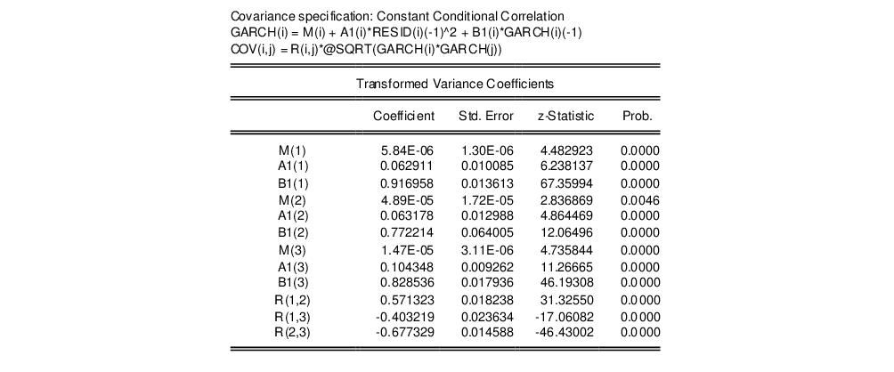 Another possibility is to model the covariance matrix using the CCC specification, which imposes a constant correlation over time. We proceed by creating a new system with specification identical to the one above. We'll select Constant Conditional Correlation this time as the for estimation and leave the remaining settings as they are. The basic results: