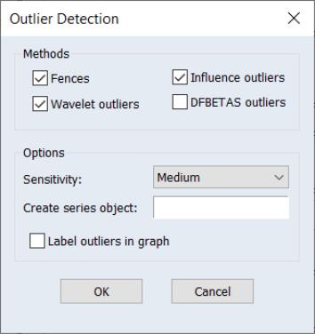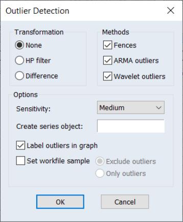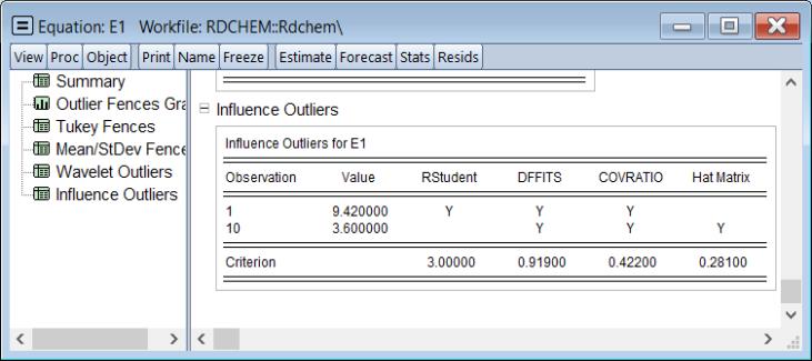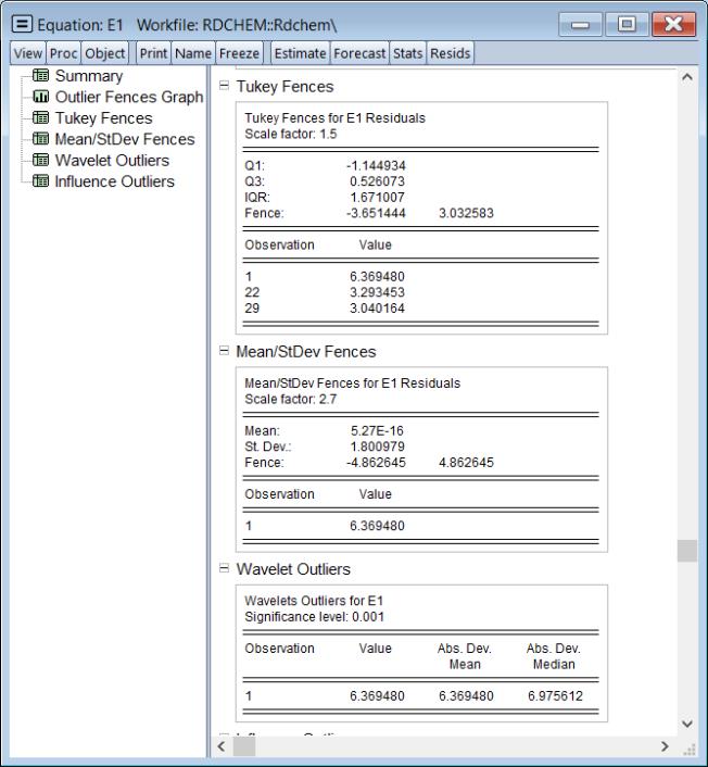 Note that selecting the box will instruct EViews to employ both Tukey and Mean/Standard Deviation fences. Selecting will use Rstudent, HatMatrix, DFFITS, and COVRATIO.