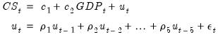 cs = c(1) + gdp^c(2) + [ar(1)=c(3), ar(2)=c(4), ar(3)=c(5), ar(4)=c(6), ar(5)=c(7)]