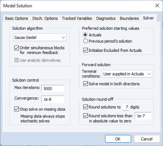 • The Solve in both directions option affects how the solver loops over periods when calculating forward solutions. When the box is not checked, the solver always proceeds from the beginning to the end of the forecast period during the Gauss-Seidel iterations. When the box is checked, the solver alternates between moving forwards and moving backwards through the forecast period.