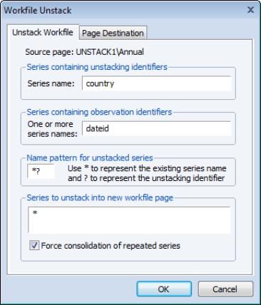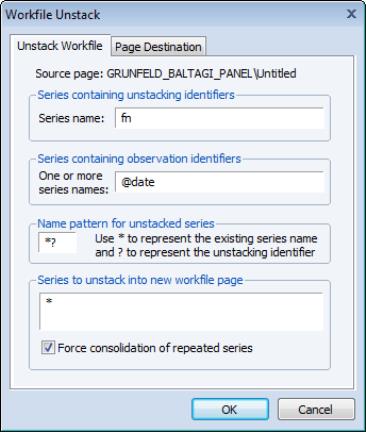 By default, EViews will unstack the data in a new UNTITLED page in the existing workfile. You may provide an alternative destination by clicking on the tab in the dialog, and entering the desired destination.