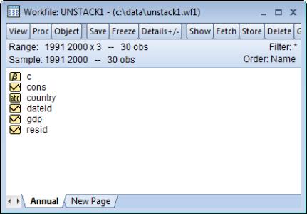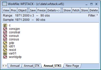 Here, we instruct EViews to put the stacked series in the workfile named STACKWF in the named page ANNUALPANEL. If a page with that name already exists in the workfile, EViews will create a new page using the next available name.