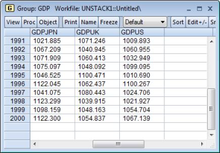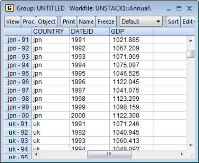 Opening the GDP group spreadsheet, we see the result of unstacking the original GDP series into three series: GDPJPN, GDPUK, and GDPUS. In particular, the values of the GDPJPN and GDPUK series should be compared with the values of GDP depicted in the group spreadsheet view of the stacked data.