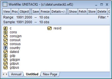 Lastly, EViews has created a pool object named COUNTRY, corresponding to the specified unstack ID series, containing all of the unstacking identifiers. Since the unstacked series have names that were created using the specified name pattern, this pool object is perfectly set up for working with the unstacked data.