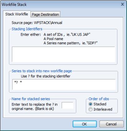 Individual series may also be stacked. You may list the names of individual simple series (e.g., “POP INC”), or you can specify your series using expressions containing the wildcard character “*” (“*”, “*C”, “F*”). The individual series will repeatedly be stacked (or interleaved), once for each ID value. If the target workfile page is in the same workfile, EViews will create a link in the new page; otherwise, the stacked series will contain repeated copies of the original values.