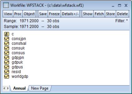 Consider an annual (1971 to 2000) workfile, “Wfstack.WF1”, that contains the six series: CONSUS, CONSUK, CONSJPN, and GDPUS, GDPUK, GDPJPN, along with the ordinary series CONSTVAL and WORLDGDP.