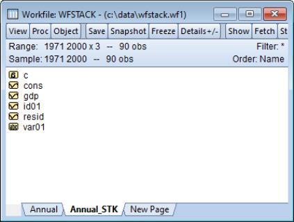 Here we see the resulting workfile page ANNUAL_STK, containing the stacked series GDP and CONS, as well as two EViews created series objects, ID01 and VAR01, that contain identifiers that may be used to structure the workfile.