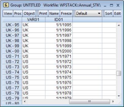 VAR01 is an alpha series that contains the stack ID values “US,” “UK,” and “JPN” which are used as group identifiers, and ID01 is a data series containing the year observation identifiers (more generally, VAR01 will contain the values of the observation identifiers from the original page).