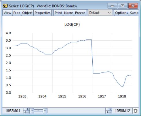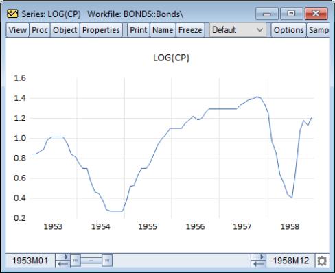 It is easy to create and use an auto-series—anywhere you might use a series name, simply enter an EViews expression. For example, suppose that you wish to plot the log of CP against time for the period 1953M01 to 1958M12. There are two ways in which you might plot these values.