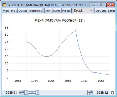 Similarly, you may use an auto-series to compute a 12-period, backward-looking, geometric moving average of the updated CP data. The command:
