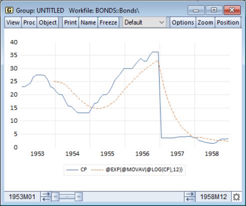 you will create a group containing two series: the ordinary series CP, and the auto-series representing the geometric moving average. We may then use the group object graphing routines to compare the original series with the smoothed series. Select from the group window toolbar and click :